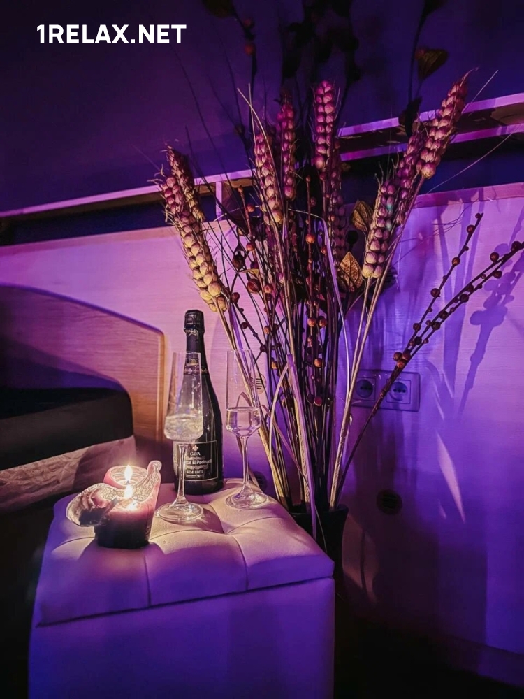 Изюминка массажного салона — прекрасная кальянная, где с комфортом может разместиться компания до четырнадцати человек. Разнообразие кальянов порадует даже искушенного ценителя.